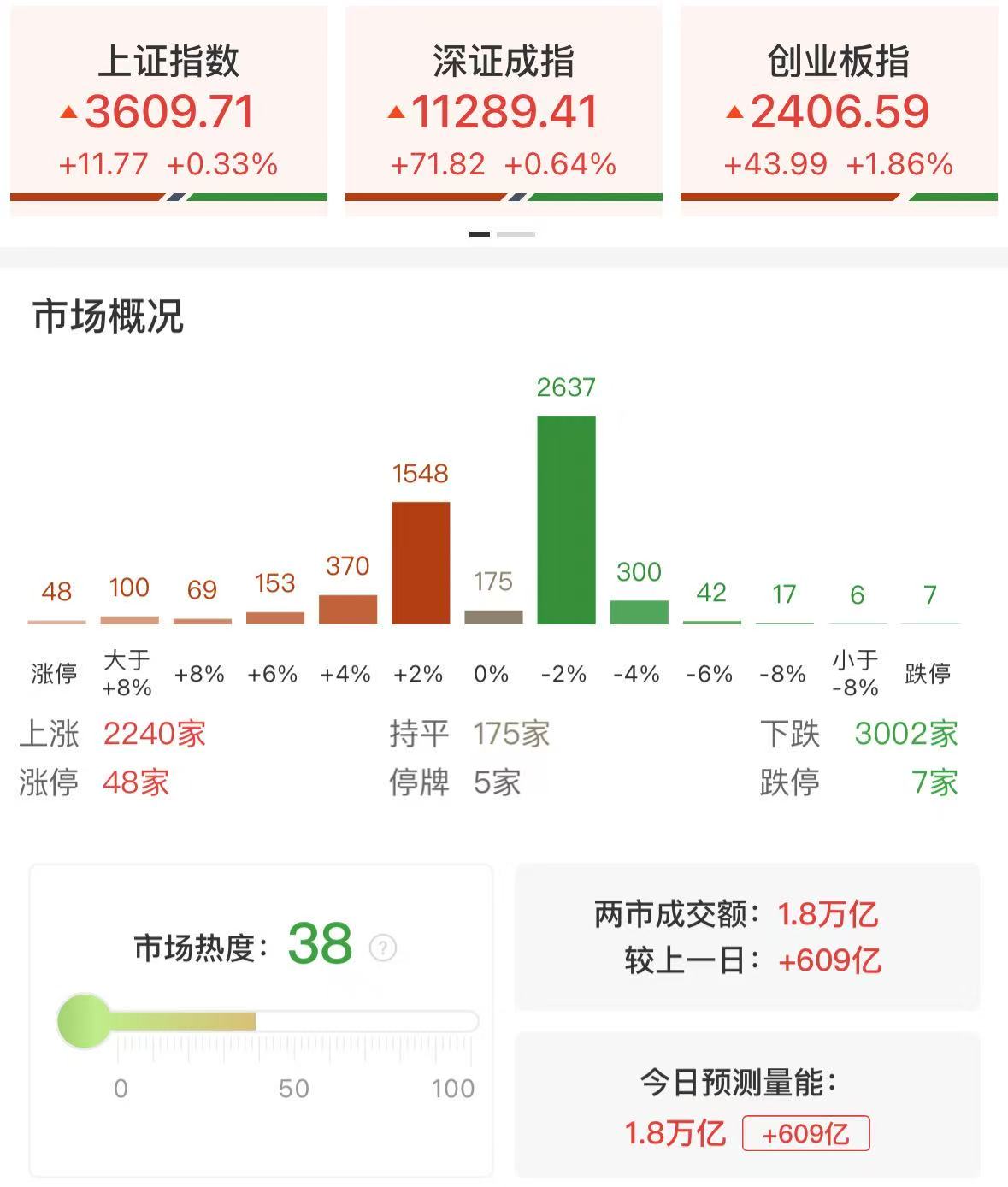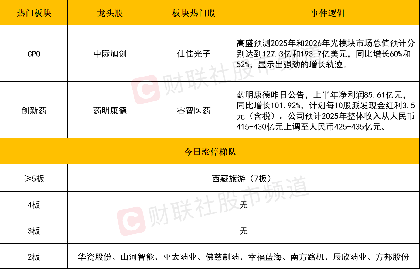 财联社7月29日讯,市场全天震荡走高,创业板指领涨。沪深两市全天成交额1.8万亿,较上个交易日放量609亿。盘面上,市场热点较为杂乱,个股跌多涨少,全市场超3000只个股下跌。从板块来看,医药股集体大涨,CRO、创新药方向领涨,辰欣药业等多股涨停。CPO等算力硬件股震荡走强,中际旭创等多股再创历史新高。超级水电概念股午后反弹,西藏天路涨停。截至收盘,沪指涨0.33%,深成指涨0.64%,创业板指涨1.86%。