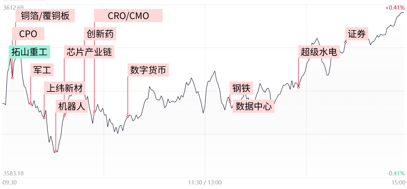 今日市场整体震荡走高,三大指数全线飘红,量能再度放大至1.8万亿,呈现“价涨量增”的态势。其中创业板在算力硬件与创新药两大权重板块的带动下,延续强势涨近2%。而沪指虽涨幅较小,但始终维持在5日线之上,或尝试通过高位横盘整固的方式完成筹码沉淀与换手。整体而言,在指数出现明显破坏性下跌以前,震荡走高结构或仍有望延续。而从盘面来看,市场同样维持良性轮动,今日除了算力硬件与创新药延续强势以外,稳定币、超级水电概念等前期陷入调整的热点方向再度获得了资金回流修复。值得注意的是,目前的市场炒作风格下,资金依旧更偏好于大容量的趋势性龙头。故后续应对上仍可按照上述逻辑,在短线陷入调整前期热点题材中,留意相关核心标的低吸机会。
