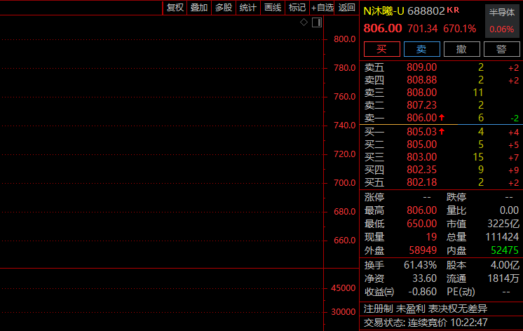 新股沐曦股份(688802)上市首日高开568.83%。该股盘中涨超700%,截至发稿股价超800元,高过摩尔线程,按开盘价计算,中一签可赚近40万元。