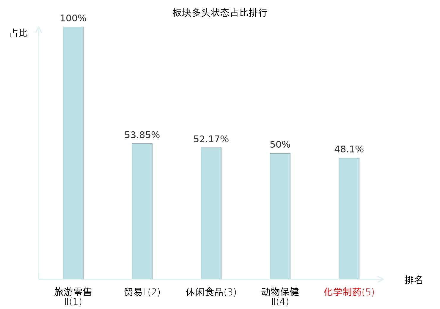 全市场所有行业板块中主力多头状态占比排名中,旅游零售Ⅱ板块位居第一。白酒Ⅱ板块名次提升最快,较昨日上升47位。