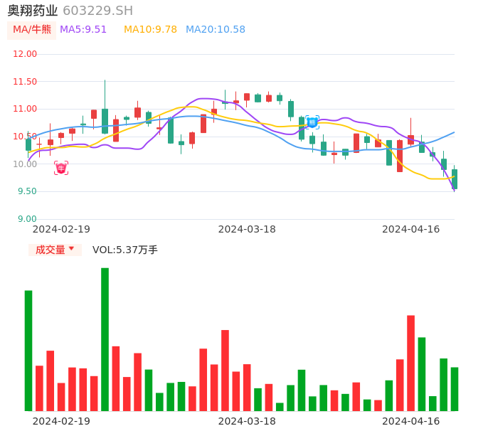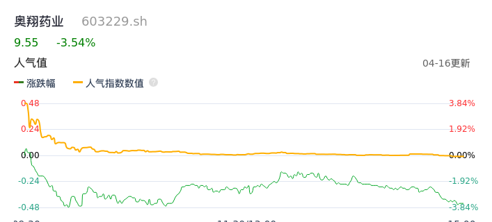 04月16日,奥翔药业收报9.55,股价涨幅-3.54%,成交金额5181.47万元,换手率0.90%。