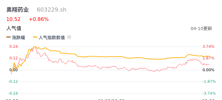 04月10日,奥翔药业收报10.52,股价涨幅0.86%,成交金额8640.98万元,换手率1.38%。