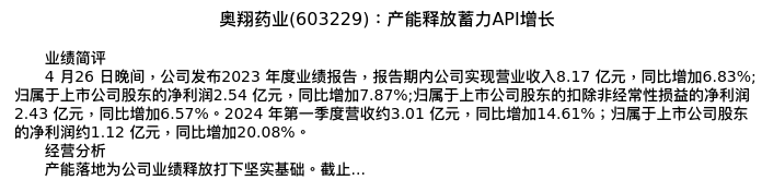 值得注意的是:2024年04月国金证券的袁维分析师,首次发布关于奥翔药业的研究报告,标题为:奥翔药业(603229):产能释放蓄力API增长。