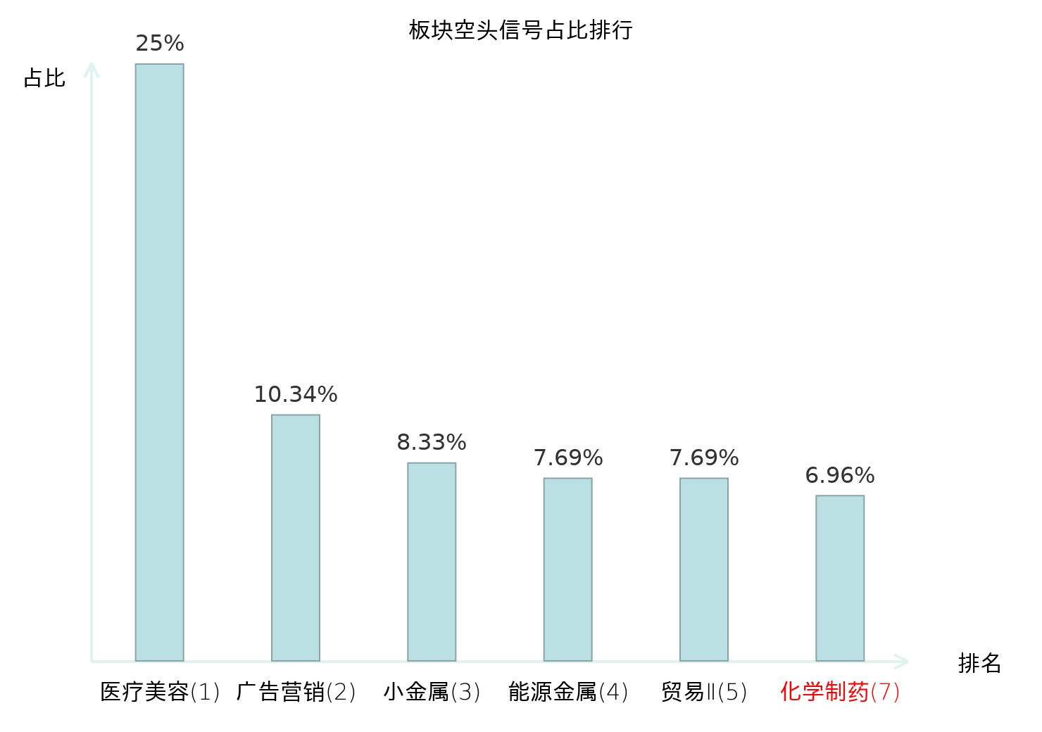 全市场所有行业板块中主力空头信号占比排名中,医疗美容板块位居第一。广告营销板块名次提升最快,较昨日上升113位。