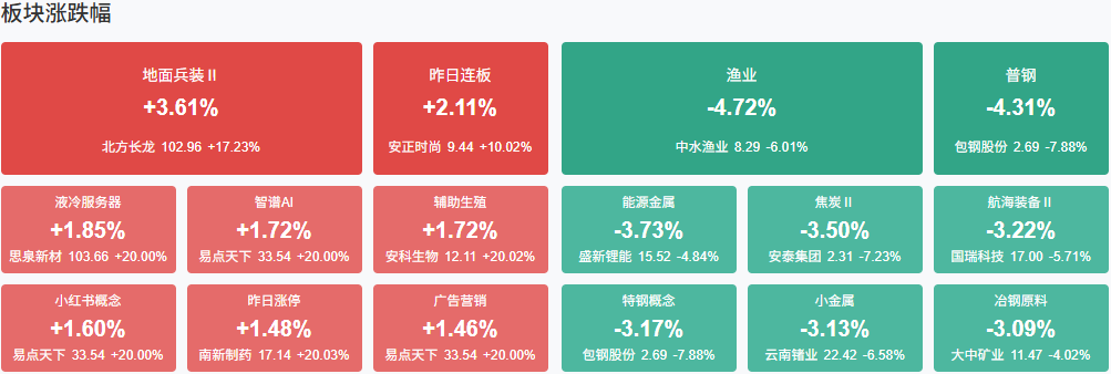 板块方面,辅助生殖、液冷IDC、信创、华为昇腾等板块涨幅居前,钢铁、煤炭、有色、影视等板块跌幅居前。截至收盘,沪指跌1.18%,深成指跌1.73%,创业板指跌1.66%。