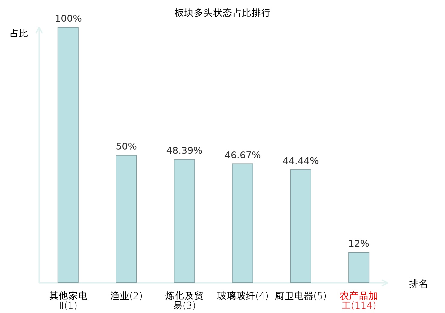 全市场所有行业板块中主力多头状态占比排名中,其他家电Ⅱ板块位居第一。冶钢原料板块名次提升最快,较昨日上升67位。
