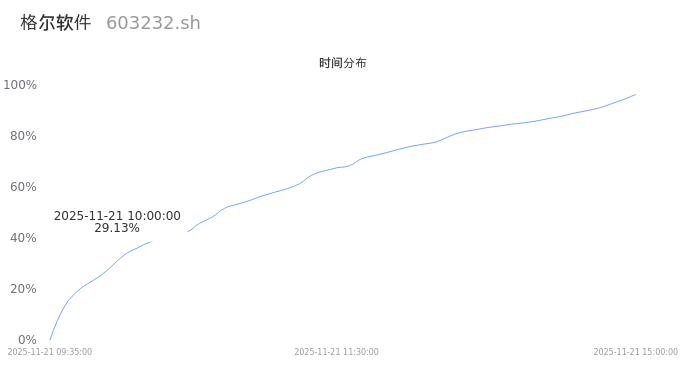 603232格尔软件2025年11月21日成交41.56万手,成交金额10.58亿,相较昨日缩量9.04万手,换手率17.97%,成交活跃。