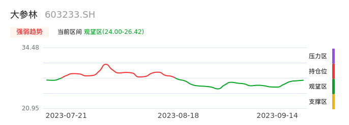 我们来看一下该股的九方特色指标强弱趋势的情况:大参林自08月18日从持仓区下穿到观望区。股价近期持续下跌后,短期出现止跌迹象。后续重点关注能否再次站上多空分界点:26.42元。如未能有效突破则可能进入新一轮空头行情。