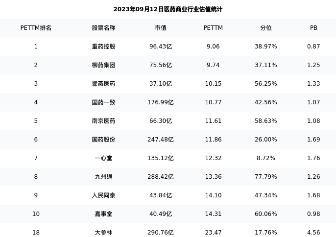 从估值角度看:大参林最新市盈率PETTM为23.47,在行业内排名18/32,处于17.76分位。