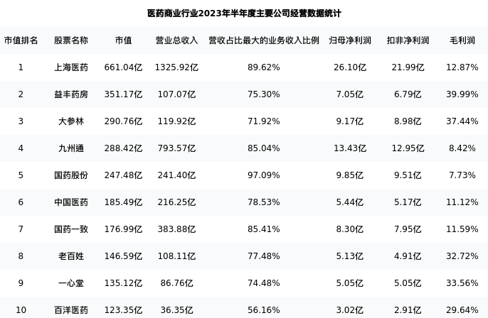 大参林最新报告期数据为半年度,下表汇总了医药商业行业内市值靠前的公司半年度主要经营数据
