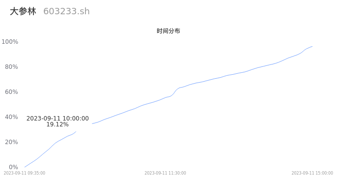 首先我们来看当日成交的时间分布。将今日交易时间按照5分钟的时间间隔进行切片,并绘制分布直方图进行观察。可以发现,10点之前的成交量占全天成交量的19.12%,这说明,该股票活跃时段换手率一般,资金热度较一般。