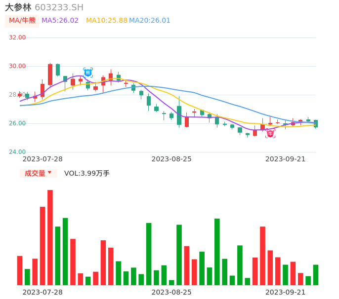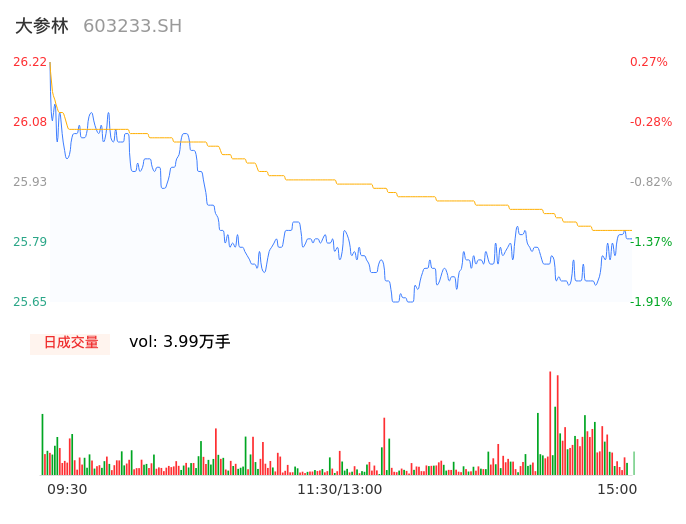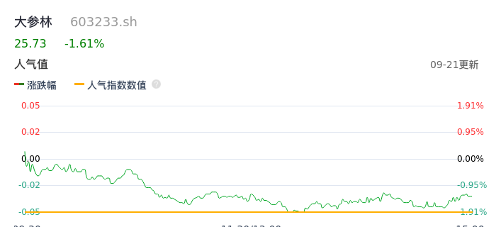 09月21日,大参林收报25.73,股价涨幅-1.61%,成交金额1.03亿元,换手率0.35%。