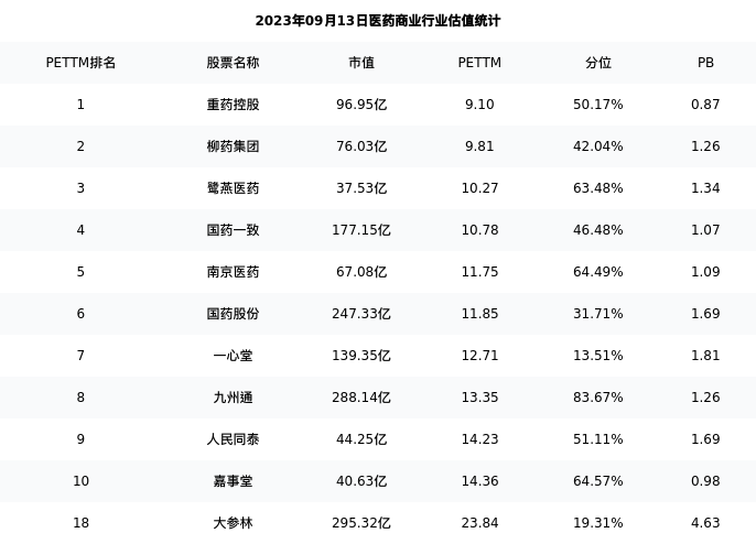 从估值角度看:大参林最新市盈率PETTM为23.84,在行业内排名18/32,处于19.31分位。