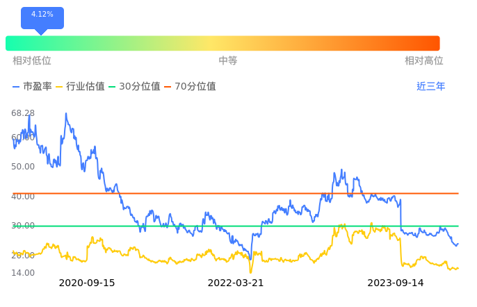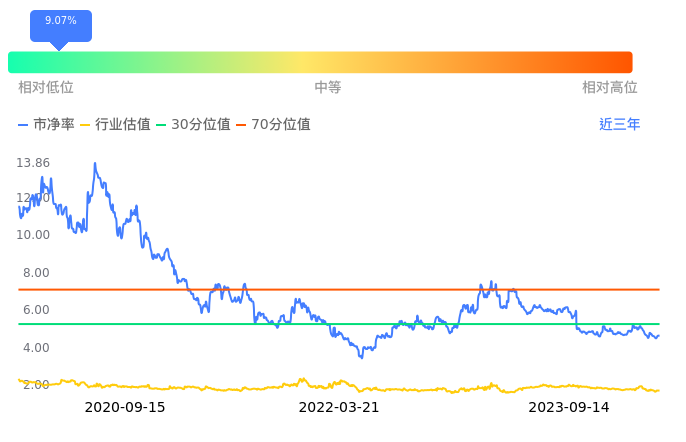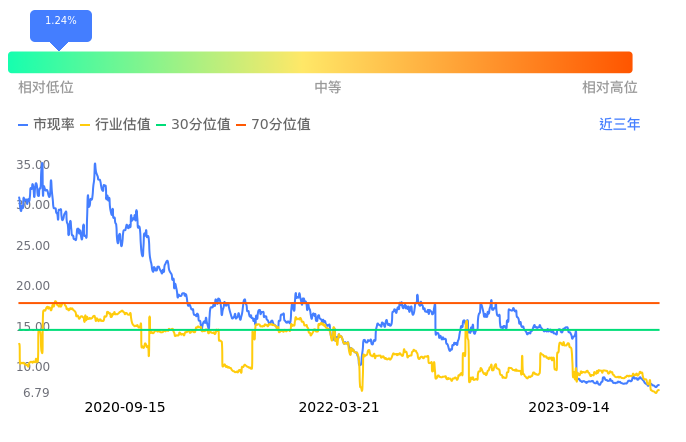 2023年09月14日,大参林上涨0.15%收于26.05,今日成交金额1.23亿元。下文将从市盈率PETTM、市净率PB、市现率3个角度去分析公司估值情况。