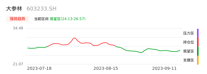 我们来看一下该股的九方特色指标强弱趋势的情况:大参林自08月18日从持仓区下穿到观望区。股价近期持续下跌后,短期出现止跌迹象。后续重点关注能否再次站上多空分界点:26.57元。如未能有效突破则可能进入新一轮空头行情。