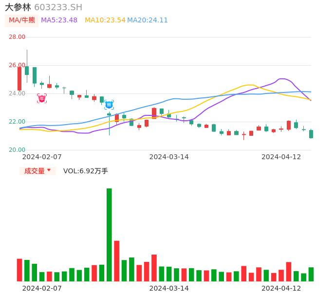 04月12日,大参林收报20.85,股价涨幅-2.66%,成交金额1.45亿元,换手率0.61%。