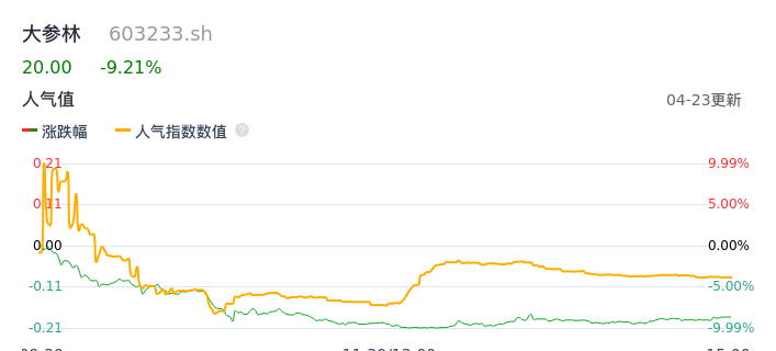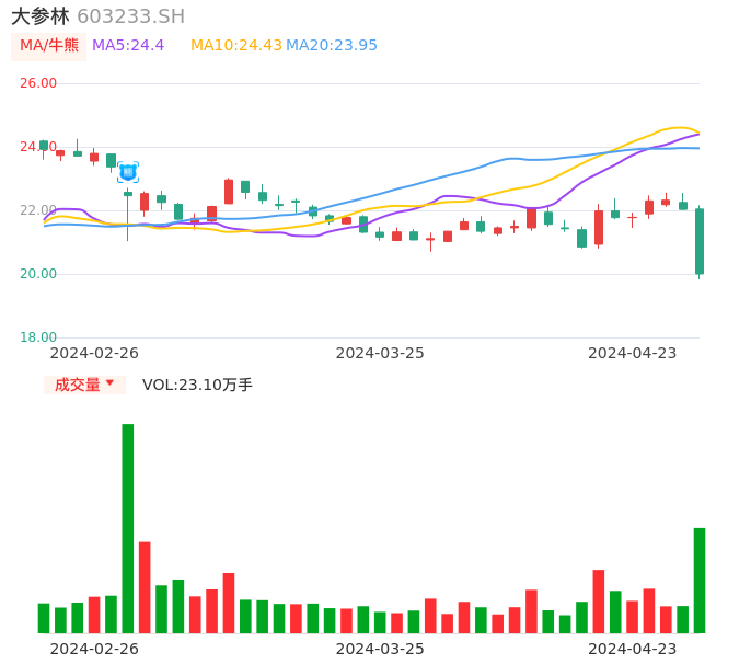 04月23日,大参林收报20.00,股价涨幅-9.21%,成交金额4.73亿元,换手率2.03%。