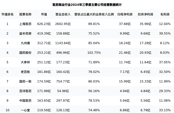 大参林最新报告期数据为三季度,下表汇总了医药商业行业内市值靠前的公司三季度主要经营数据