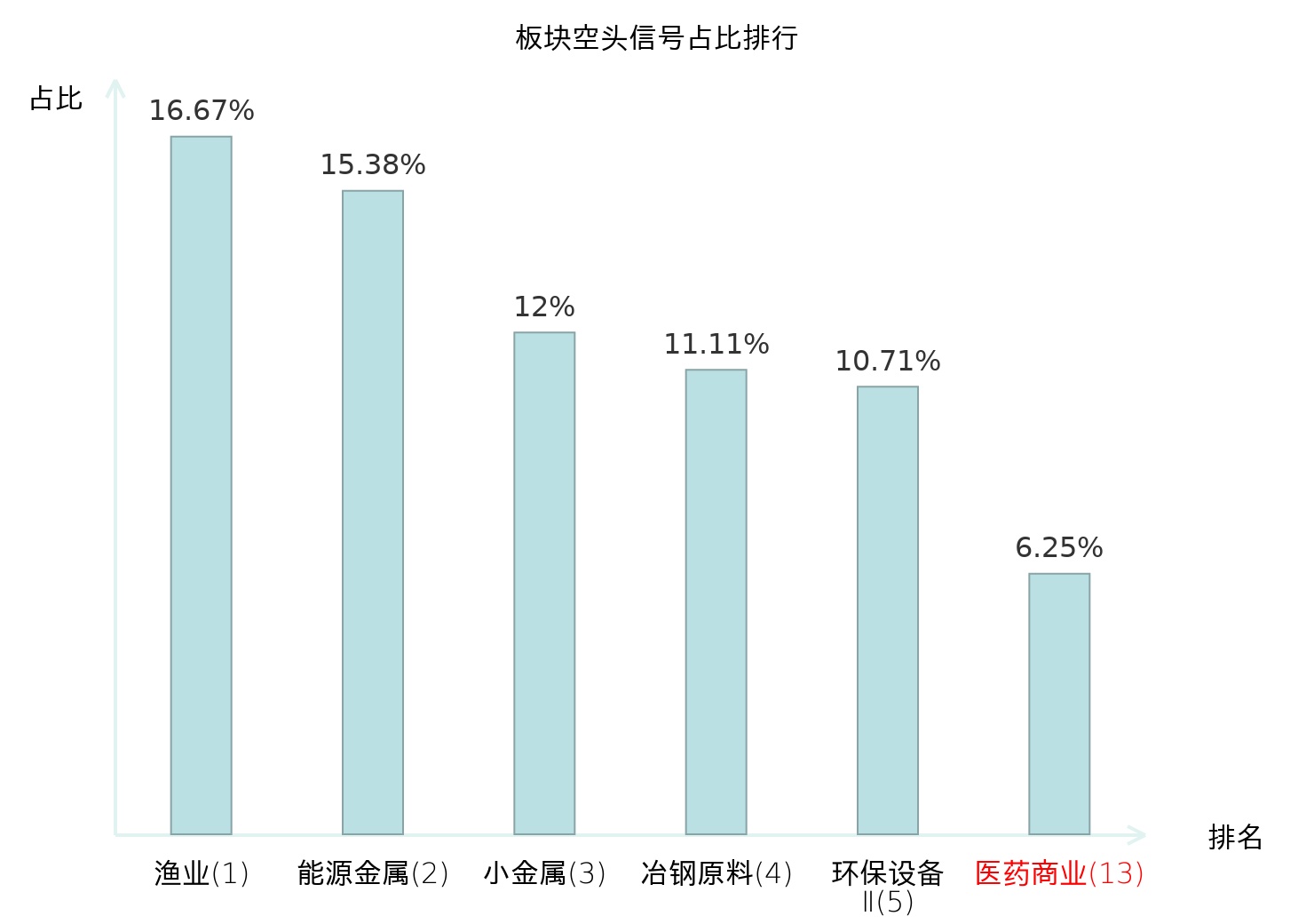 全市场所有行业板块中主力空头信号占比排名中,渔业板块位居第一。调味发酵品Ⅱ板块名次提升最快,较昨日上升106位。