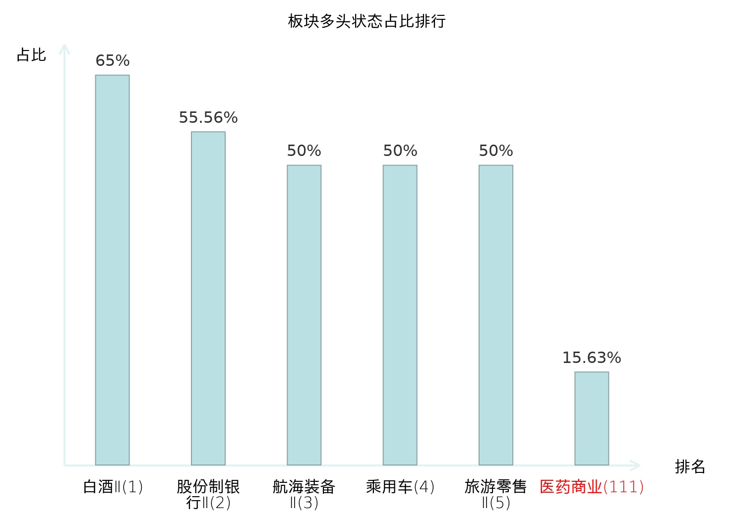 全市场所有行业板块中主力多头状态占比排名中,白酒Ⅱ板块位居第一。其他家电Ⅱ板块名次提升最快,较昨日上升93位。