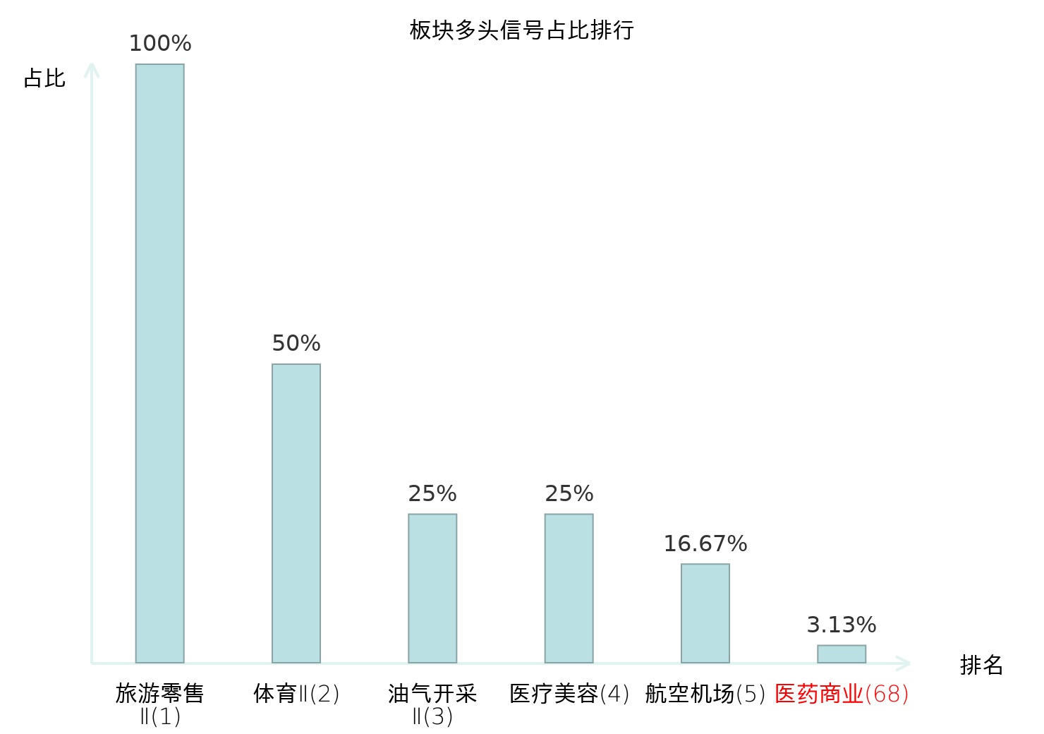 全市场所有行业板块中主力多头信号占比排名中,旅游零售Ⅱ板块位居第一。旅游零售Ⅱ板块名次提升最快,较昨日上升130位。