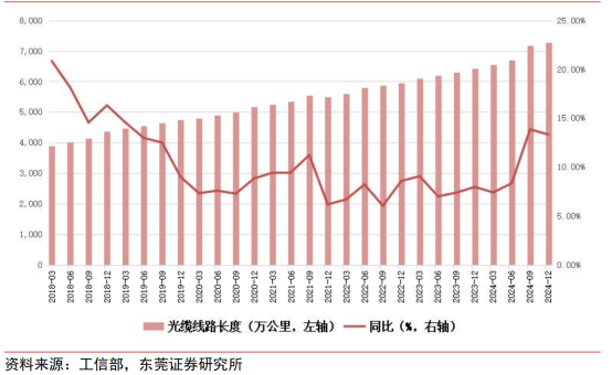 C)光缆线路长度:根据工信部数据,2024年Q4光缆线路长度约7,288万公里,同比增长13.31%,环比上升1.46%。