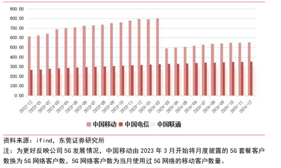 E)5G运营商移动业务用户数:根据公司公告披露数据,2024年12月中国移动、中国电信、中国联通5G移动电话业务用户数分别约达5.52亿户、3.51亿户、2.87亿户,分别环比上升0.97%、0.60%、0.35%。