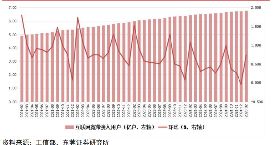 B)互联网宽带接入用户规模:根据工信部数据,2025年2月互联网宽带接入用户规模约6.75亿户,同比上升6.04%,环比上升0.74%。