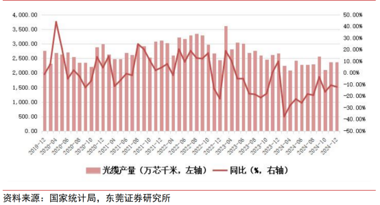 D)光缆产量:根据国家统计局数据,2024年12月光缆产量为2,368.70万芯千米,同比下降12.20%,环比上升0.52%。