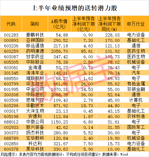 从目前披露的半年度业绩预告来看,按照预告净利润下限计算(无下限则取公告数值),22股上半年净利润同比增长。5股净利润翻倍增长,分别是豪鹏科技、亚钾国际、移远通信、药明康德、甘李药业。