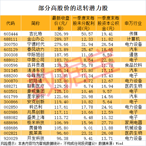 在众多送转潜力股中,一季度末每股未分配利润最多的也是吉比特,达到50.57元;其次是古井贡酒、新华保险、宁德时代、春风动力、奥泰生物等。