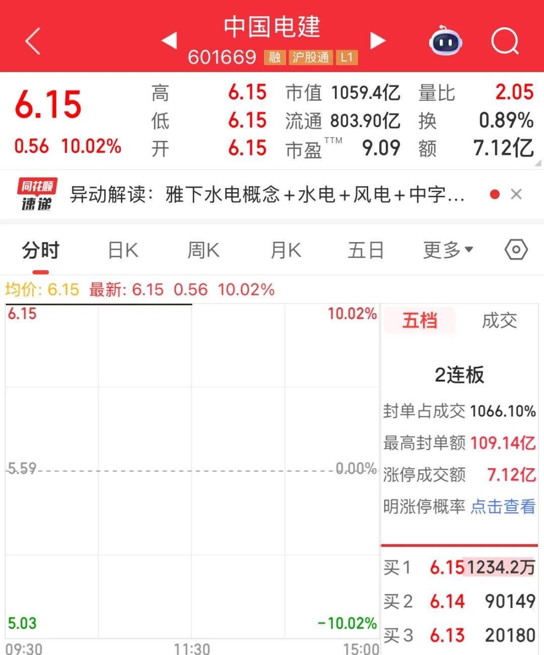 雅江水电概念股再次出现涨停潮,中国电建再次“一”字涨停,截至午间收盘,涨停板封单达到1234万手,涨停板封单排在A股第一位。