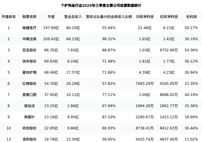 诺邦股份最新报告期数据为三季度,下表汇总了个护用品行业内市值靠前的公司三季度主要经营数据