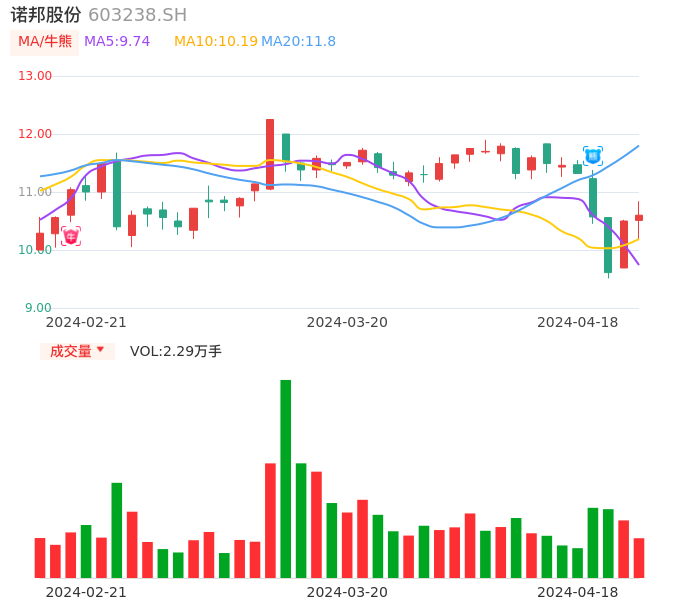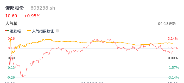 04月18日,诺邦股份收报10.60,股价涨幅0.95%,成交金额2421.14万元,换手率1.29%。