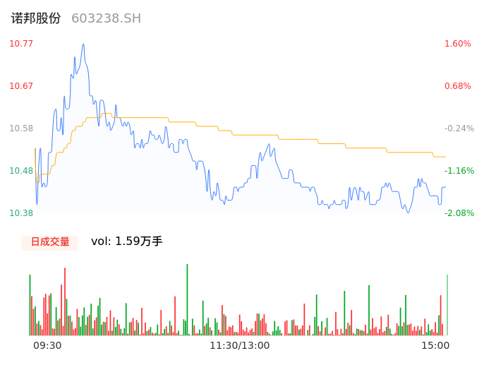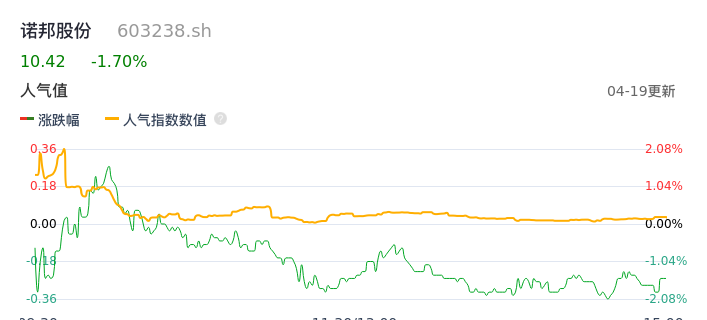 04月19日,诺邦股份收报10.42,股价涨幅-1.70%,成交金额1668.37万元,换手率0.89%。
