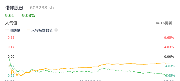 04月16日,诺邦股份收报9.61,股价涨幅-9.08%,成交金额3902.74万元,换手率2.24%。