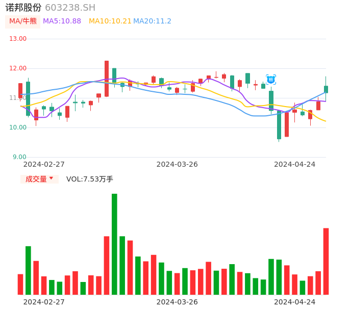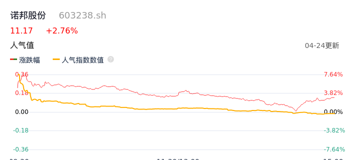 04月24日,诺邦股份收报11.17,股价涨幅2.76%,成交金额8568.04万元,换手率4.24%。