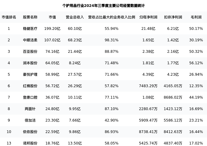 诺邦股份最新报告期数据为三季度,下表汇总了个护用品行业内市值靠前的公司三季度主要经营数据