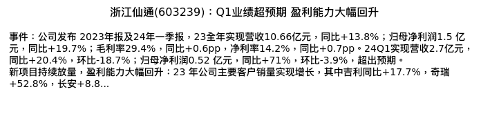 值得注意的是:2024年04月西南证券的郑连声分析师,首次发布关于浙江仙通的研究报告,标题为:浙江仙通(603239):Q1业绩超预期 盈利能力大幅回升。