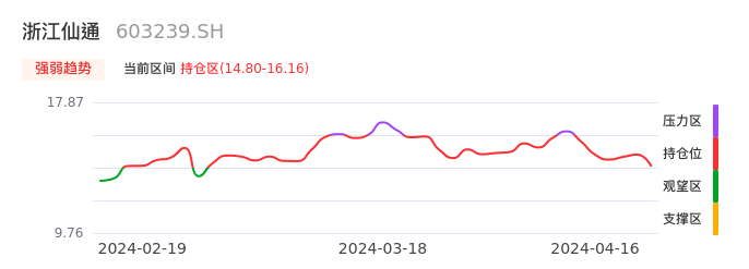 我们来看一下该股的九方特色指标强弱趋势的情况:浙江仙通自04月09日从压力区回到持仓区。股价近期持续调整。后续重点关注能否站稳多空分界点:14.80元。如被有效击穿则将进入空头行情。