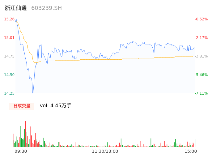 04月16日,浙江仙通收报14.85,股价涨幅-3.19%,成交金额6567.85万元,换手率1.64%。