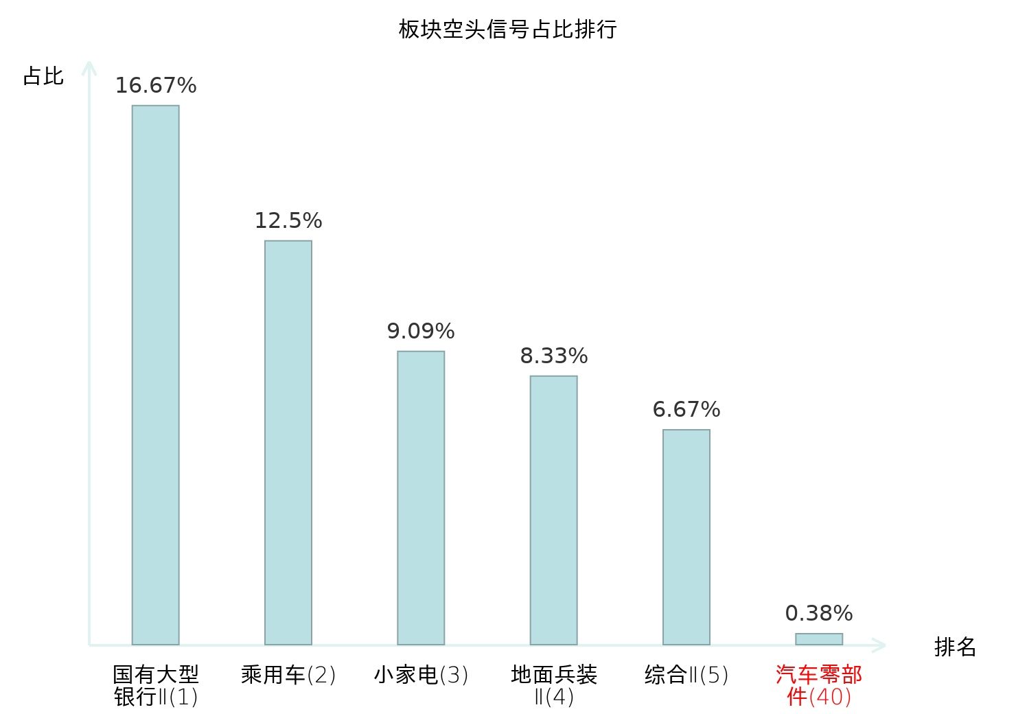 全市场所有行业板块中主力空头信号占比排名中,国有大型银行Ⅱ板块位居第一。铁路公路板块名次提升最快,较昨日上升120位。