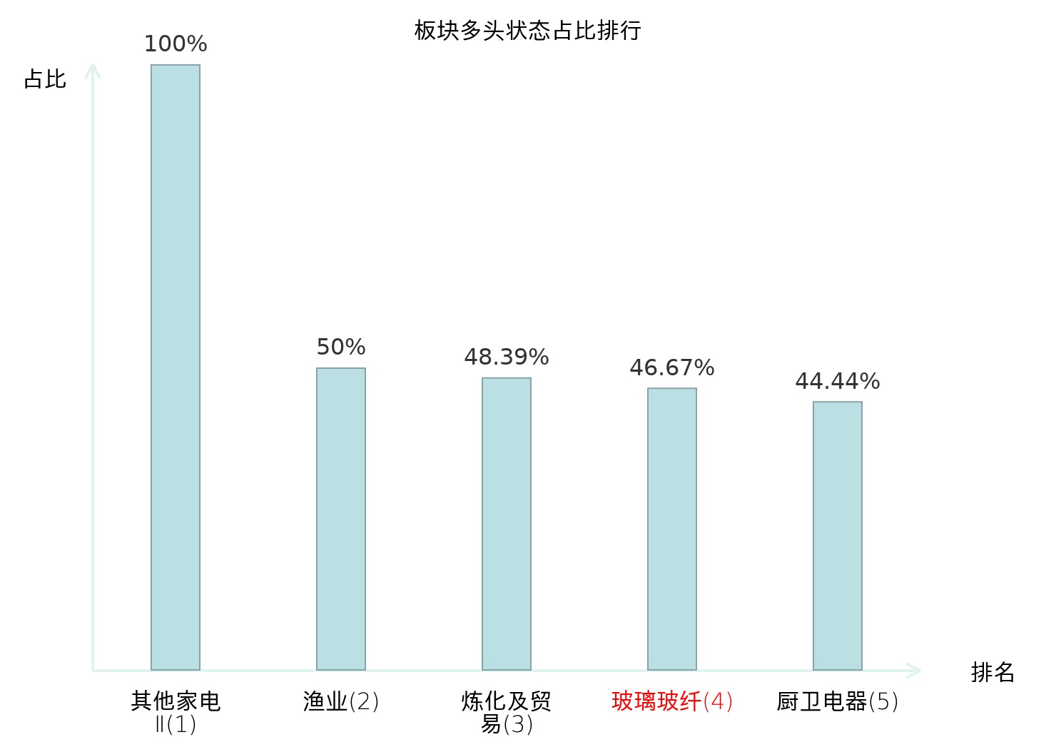 全市场所有行业板块中主力多头状态占比排名中,其他家电Ⅱ板块位居第一。冶钢原料板块名次提升最快,较昨日上升67位。