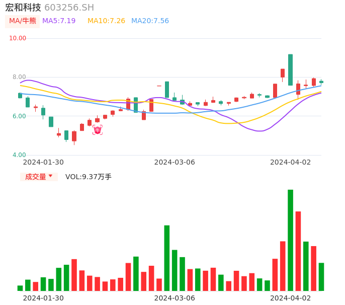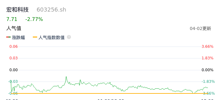 04月02日,宏和科技收报7.71,股价涨幅-2.77%,成交金额7222.75万元,换手率1.06%。