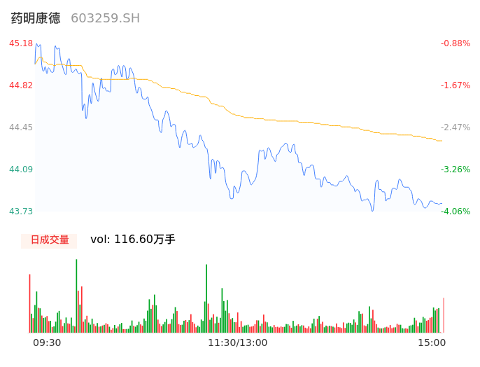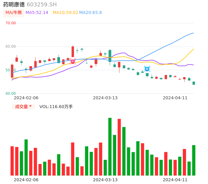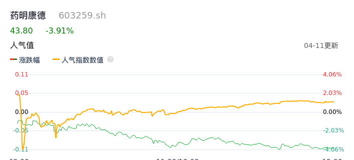 04月11日,药明康德收报43.80,股价涨幅-3.91%,成交金额51.69亿元,换手率4.58%。