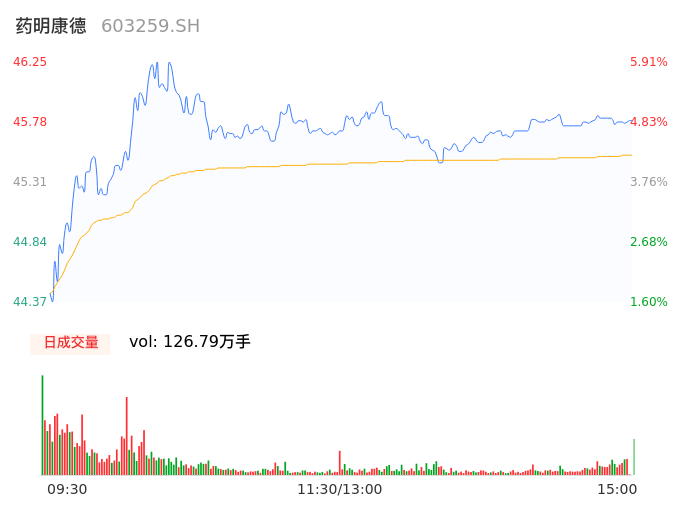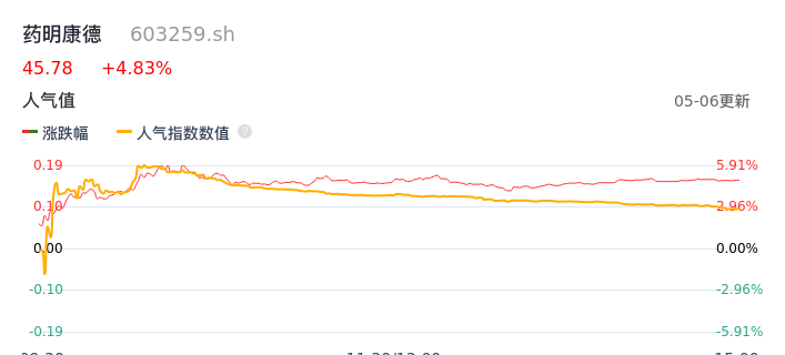 05月06日,药明康德收报45.78,股价涨幅4.83%,成交金额57.72亿元,换手率4.98%。
