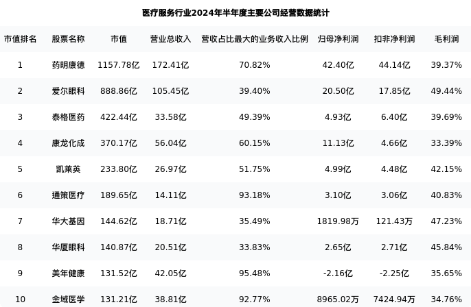 药明康德最新报告期数据为半年度,下表汇总了医疗服务行业内市值靠前的公司半年度主要经营数据