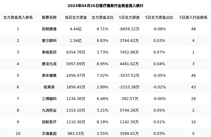 从主力资金流向来看,医疗服务行业今日主力资金流入59.27亿元,在所有申万二级行业中排名:53/131。