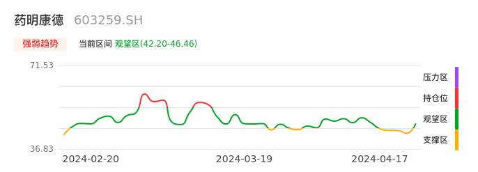 我们来看一下该股的九方特色指标强弱趋势的情况:药明康德近日从支撑区回到观望区。股价经过前期快速下跌后已经出现止跌迹象。下跌动能有所衰竭,股价目前处于反弹阶段,后续重点关注能否站上多空分界点:46.46元。如未能有效突破则说明弱势反弹行情结束。后续可能再次进入空头行情。