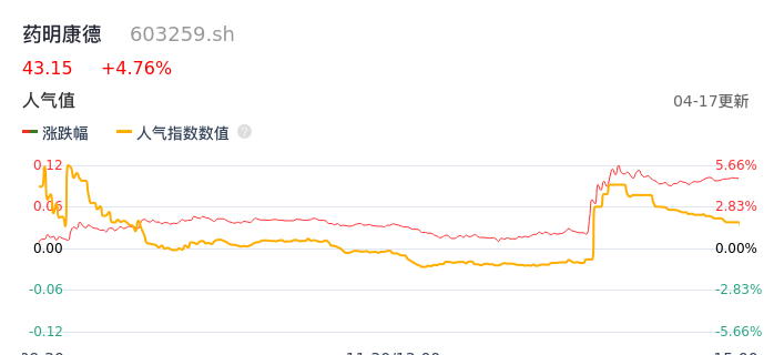 04月17日,药明康德收报43.15,股价涨幅4.76%,成交金额47.54亿元,换手率4.41%。